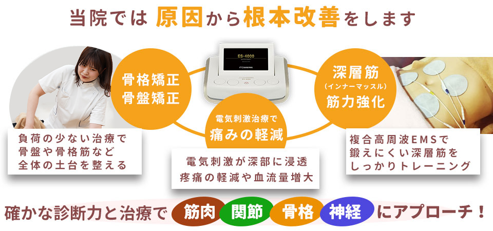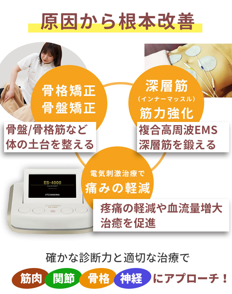 痛みの軽減、深層筋の強化、姿勢の改善に効果の高い最新医療機器を導入しています。また熟練スタッフによる的確な診断と施術で納得の施術をご提供いたします。