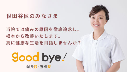 世田谷区・祖師谷(祖師ヶ谷大蔵駅前)にあるgood bye!鍼灸院・整骨院では、患者様の「人生を変える」ことを目標にして、「真に健康な身体」を手に入れ、これまでの身体の痛みや症状から「卒業」していただくをコンセプトにしています。そういった想いから、「good bye!」という名称が生まれました。