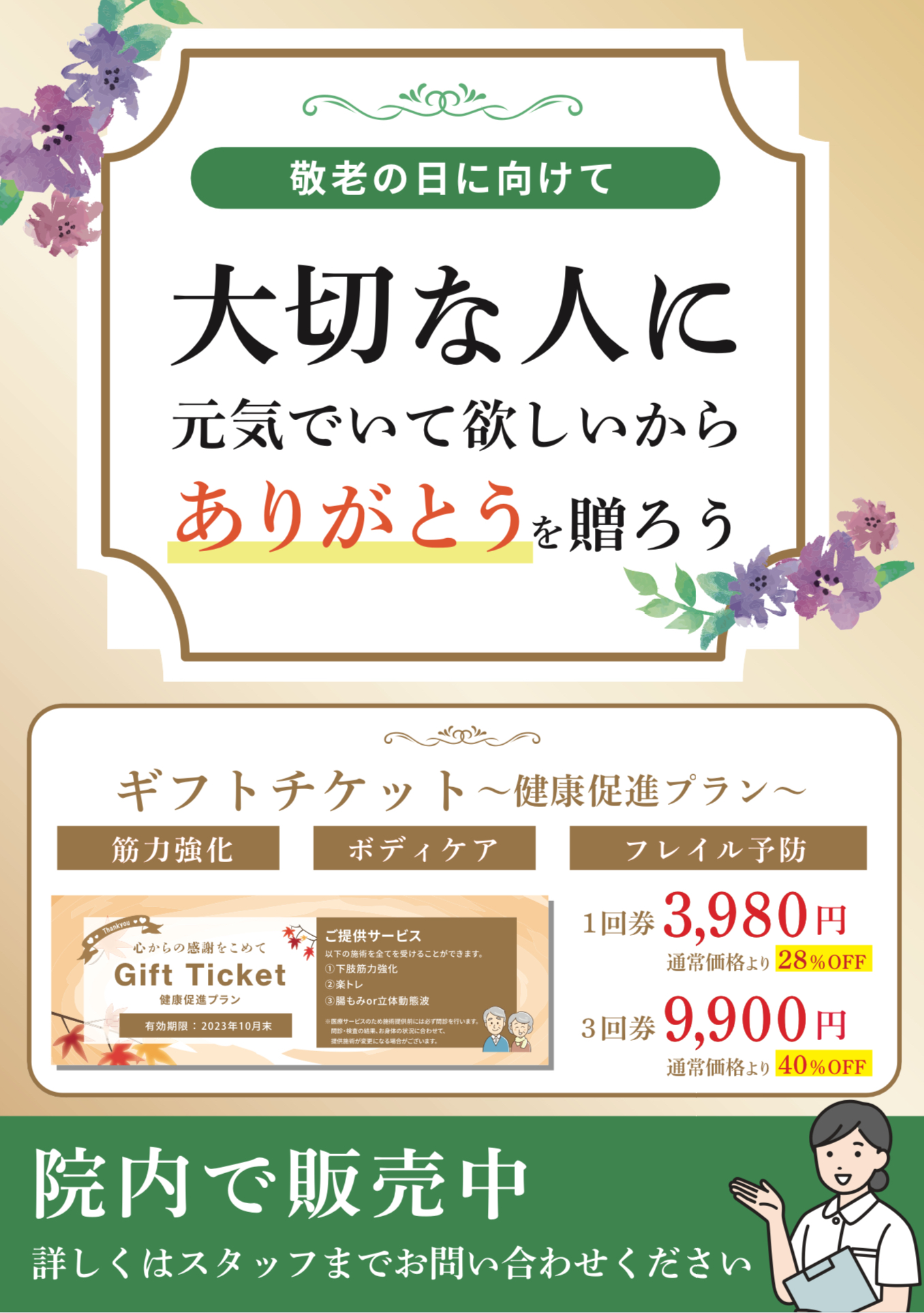 こんにちは! スタッフの岩崎です。 イベントのお知らせです! 今年も9/16~9/18に 「敬老の日イベント」を開催します! 日頃の感謝の気持ちを込めまして、 精一杯治療させていただきます。 またささやかながらご来院いただいた皆様に プレゼントもご用意しております! 皆様お誘いあわせの上、ご来院ください。
